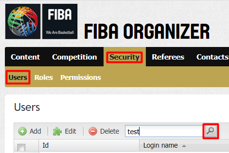 1. In Fiba Organizer Online go to Security->Users, type user name/surname in Search box and click Enter button.