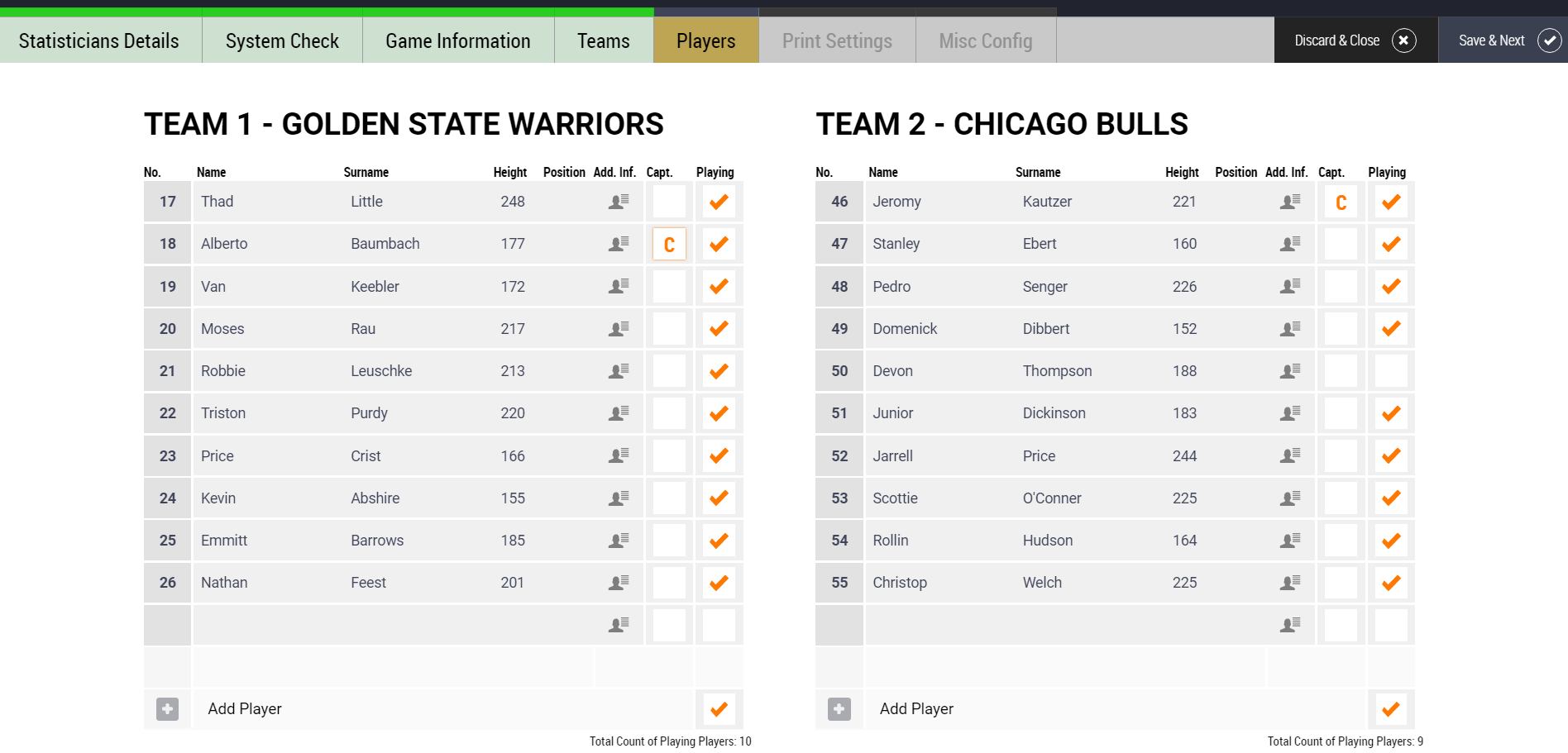 5. Statisticians will then be prompted to confirm the players participating in the game and the details of those players, e.g. player names, numbers, captains. Once confirmed, statisticians should click Save & Next button.