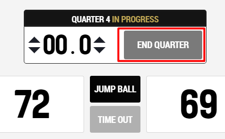 Do not setup next quarter as it will lead to overtime and there is no way back. If you have already done this, run clock to 0:00, finish the overtime and confirm score. After that players' playing time will need to be adjusted in Competition Management System to remove 5 minutes for each player who has started unnecessary overtime.