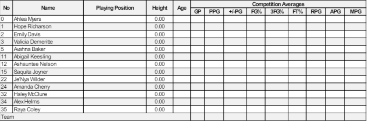 4. Start List report shows rosters for the game. Name, Starting Position, Height, Age and Competition Stats Averages are included in the report.