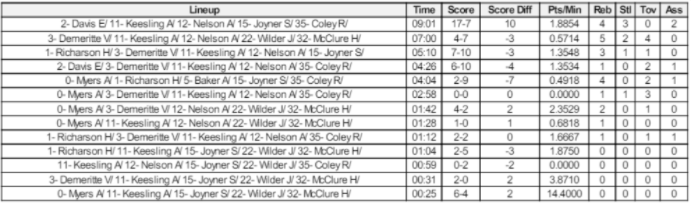 5. Line Up Analysis report has two pages - one per each team. It shows all team Lineups during the game and Time played, Score, Score Difference, Points/Minutes, Rebounds, Steals, Turnovers and Assists for each separate lineup.