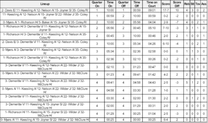 6. Rotation Analysis report is more detailed than Line Up Analysis report as it includes Quarter and Time at which lineup showed up on court and left it, Time on Court, Score, Score Difference, Rebounds, Steals, Turnovers and Assists.