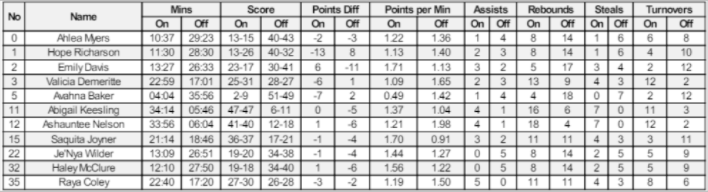 Player Number, Name, Team, Minutes Played, Points, Plus/Minus are displayed separately.