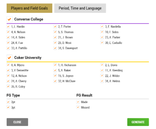 It allows to filter single or both teams, specific players, field goal types (2pt, 3pt) and results (made/missed).
