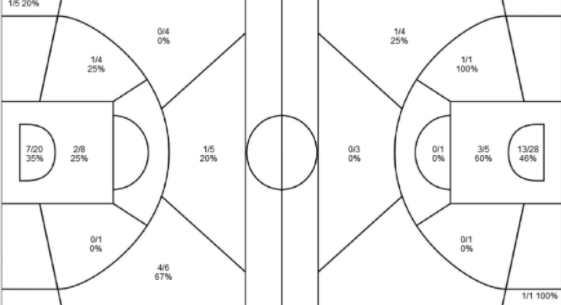 9. Shot Areas report is a one page report. It allows to filter one or both teams, specific players, FG types (2pt, 3pt), FG results (made/missed) and displays made/attempted shots and percentage of specific area.